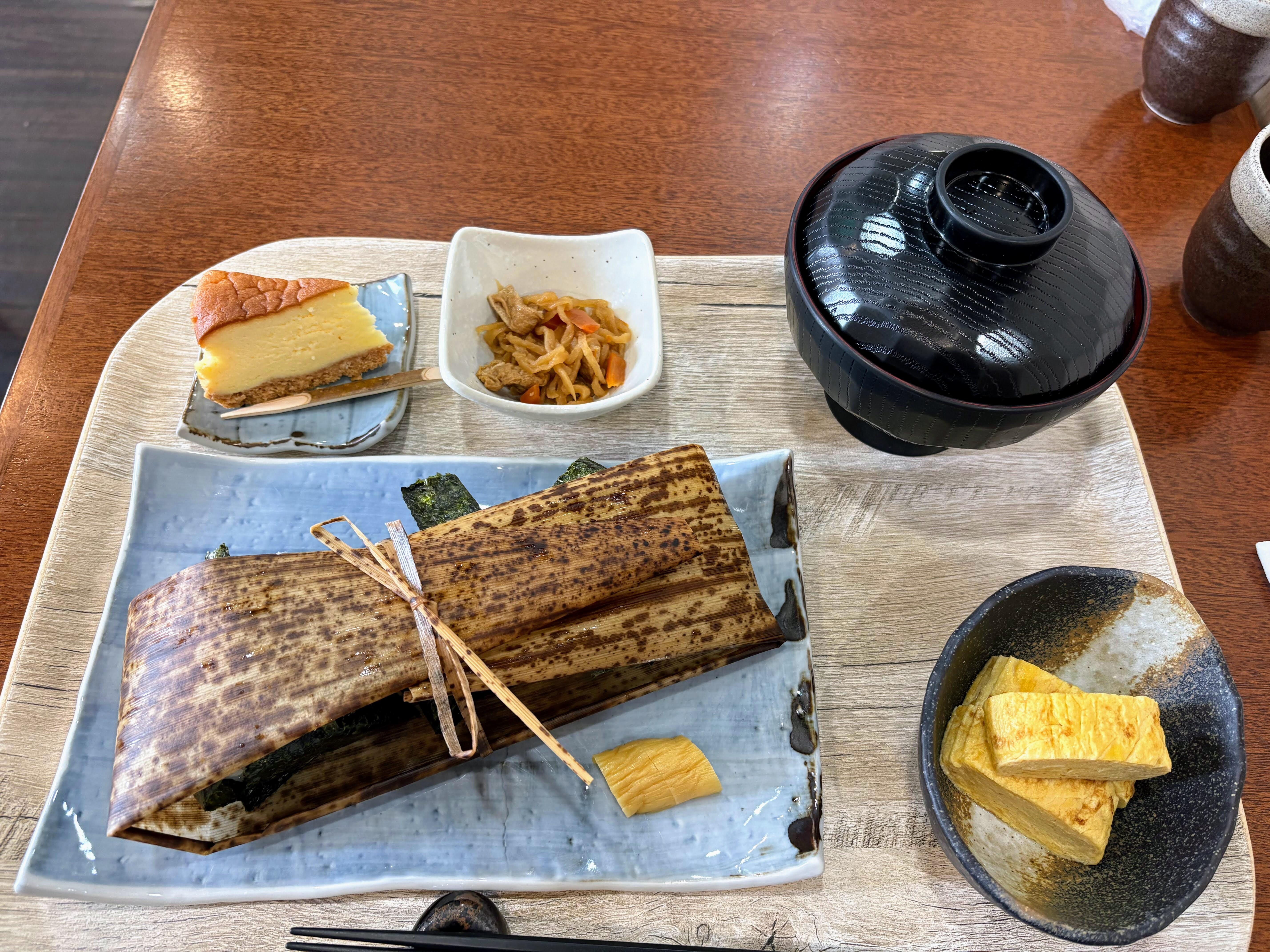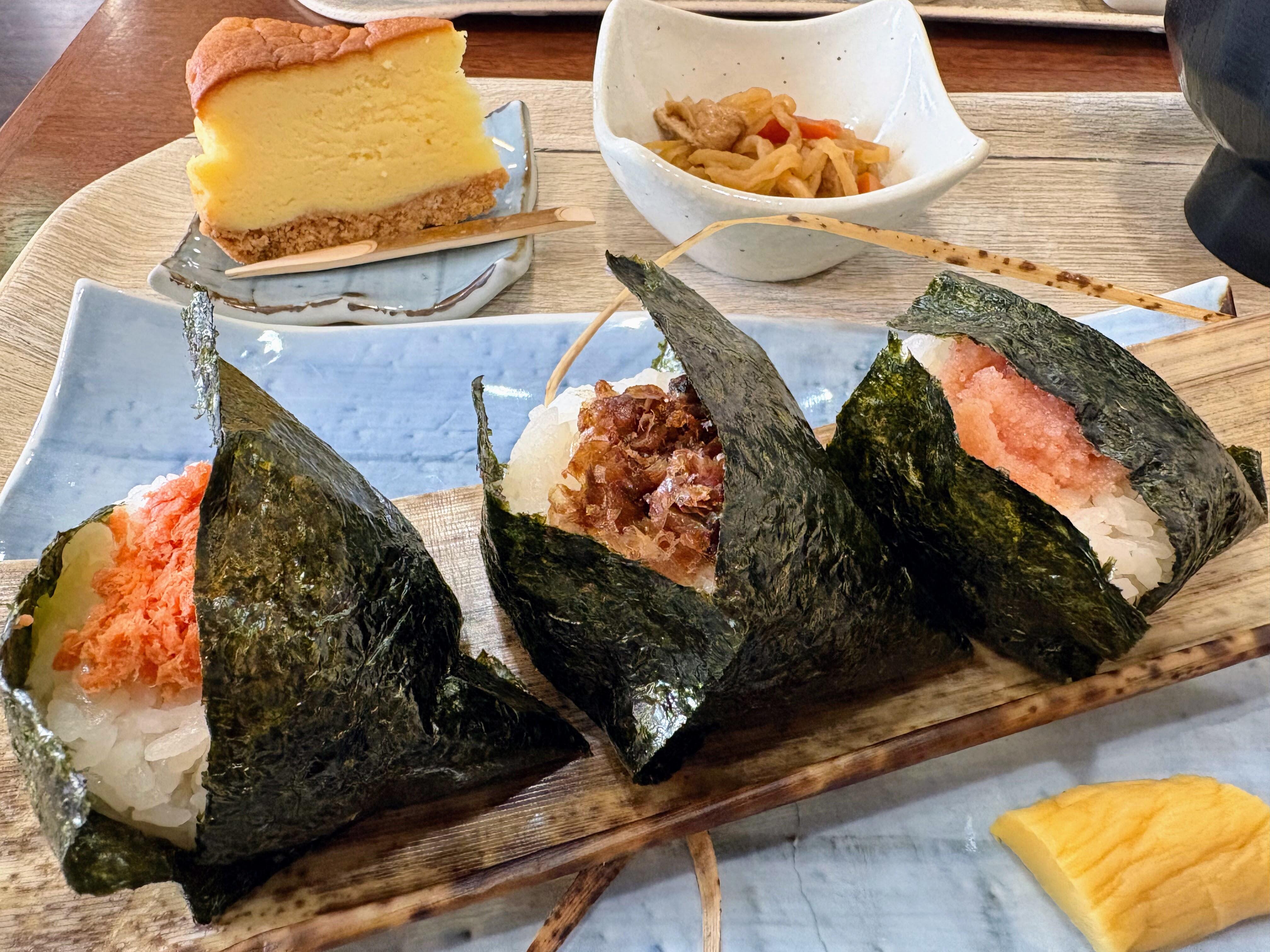 創作おにぎりが並び、味噌汁・漬物・