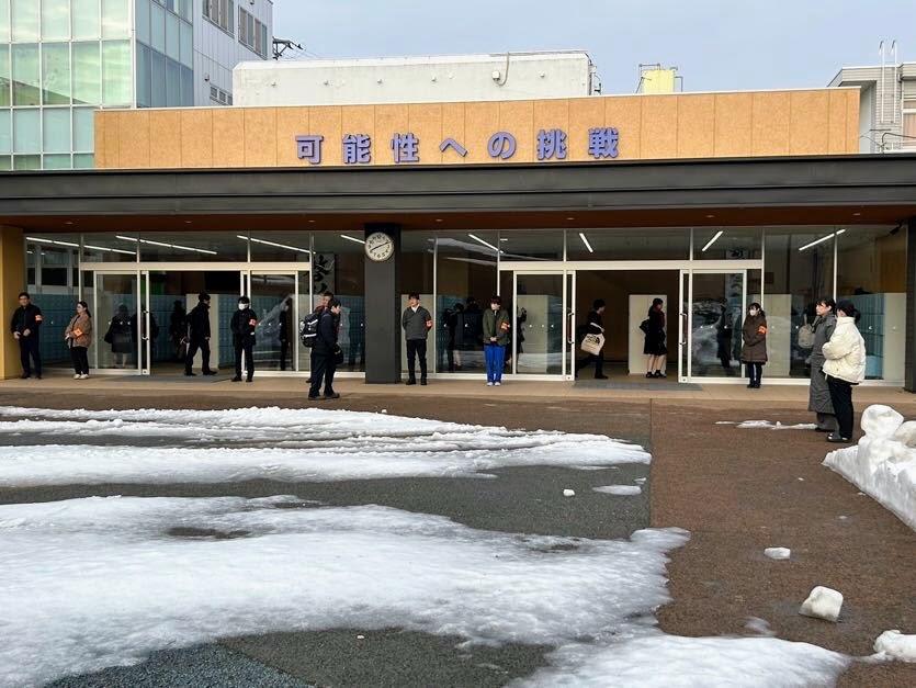 生徒玄関前に立って