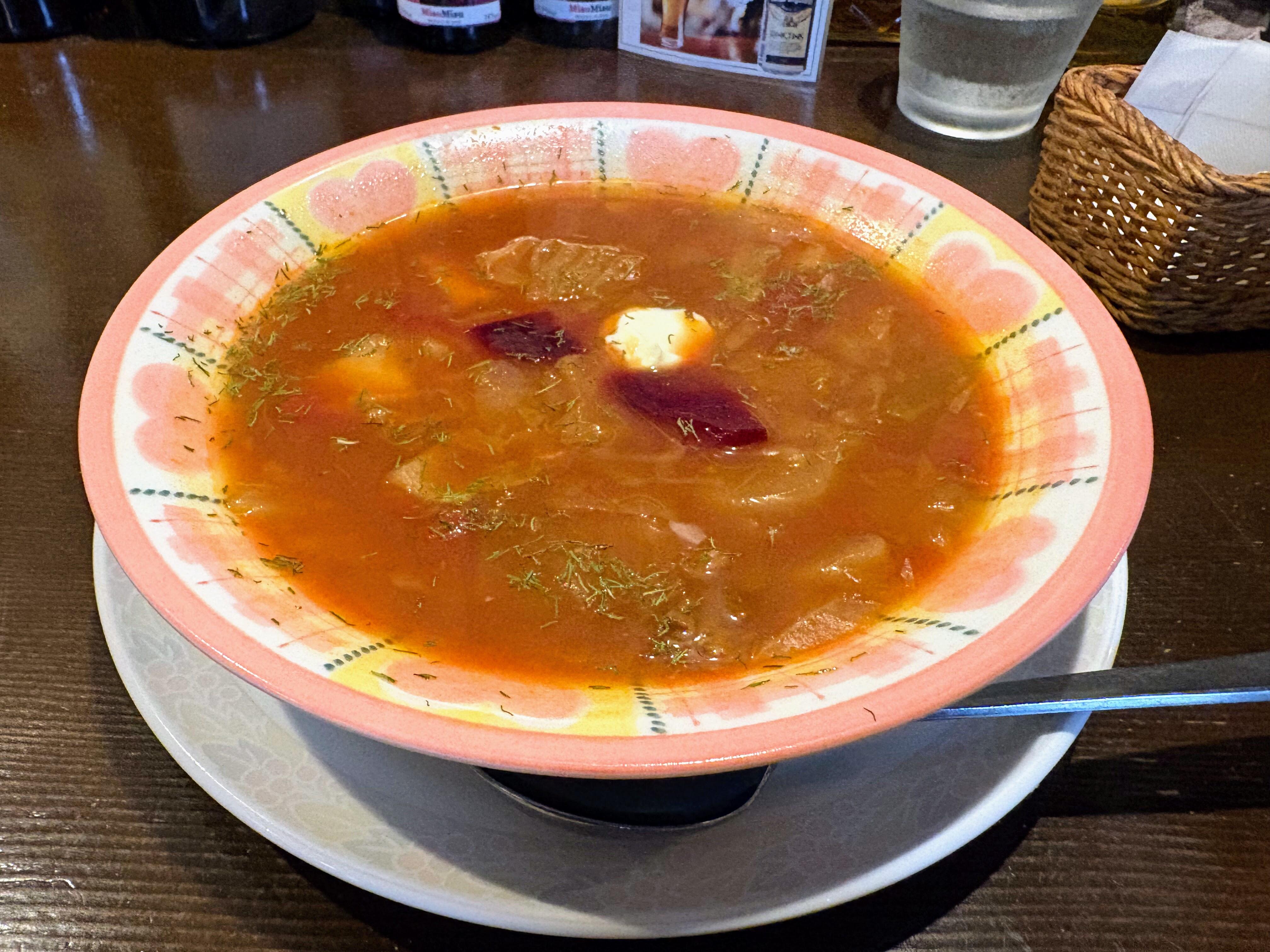 深紅色のボルシチを一口すすると、